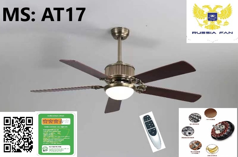 Quạt trần thương hiệu RUSSIA AT17 Là quạt dùng động cơ đồng 100%, được sản xuất trên dây chuyền hiện đại, với đội ngũ kỹ thật viên cao cấp, những sản phẩm trước khi đưa ra thị trường quản lý chất lượng nghiêm ngặt, đông cơ chạy êm, công suất lớn, mẫu mã đẹp, độ thẩm mỹ cao, phù hợp với mọi thiết kế, tạo cho không gian nhà bạn một phong cách đẹp, độc đáo.