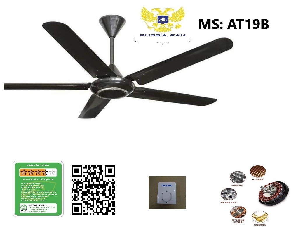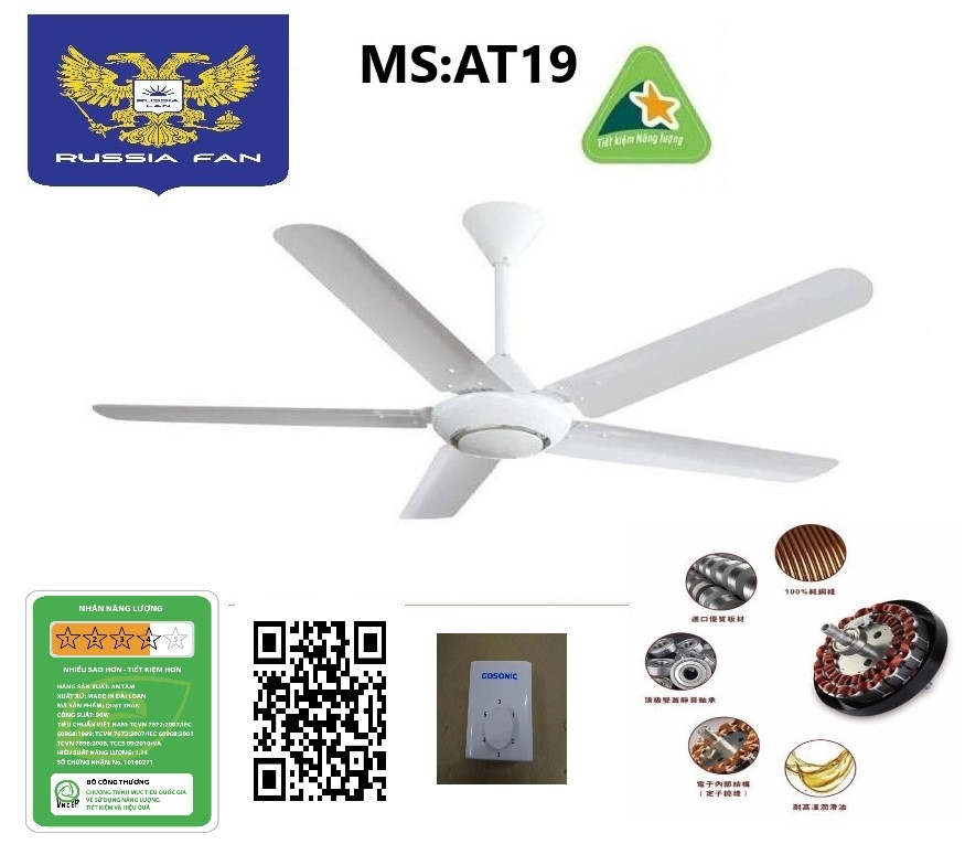 Quạt trần thương hiệu RUSSIA AT19 Là quạt dùng động cơ đồng 100%, được sản xuất trên dây chuyền hiện đại, với đội ngũ kỹ thật viên cao cấp, những sản phẩm trước khi đưa ra thị trường quản lý chất lượng nghiêm ngặt, đông cơ chạy êm, công suất lớn, mẫu mã đẹp, độ thẩm mỹ cao, phù hợp với mọi thiết kế, tạo cho không gian nhà bạn một phong cách đẹp, độc đáo.